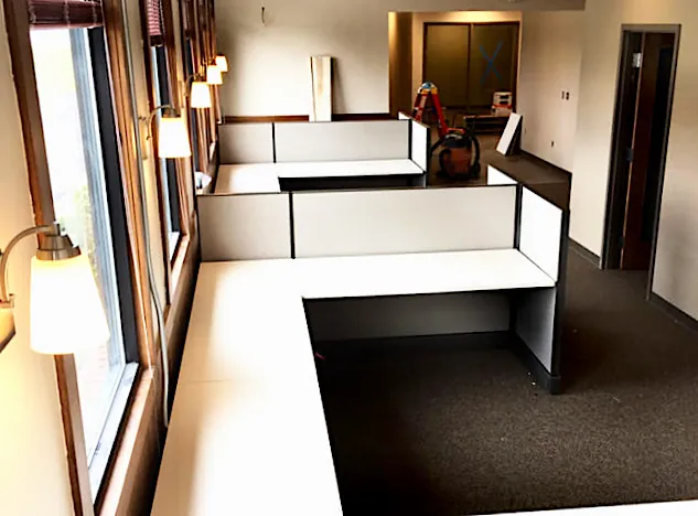This office interiors project was driven by the need to find “as-affordable-as-possible” budget office furniture for office space that gets tons of natural daylight from 3 walls of large windows. Using this to her advantage, our office designer created a business floor plan with private offices in the center and the the L shaped cubicles and U-shaped workstations lined up against the perimeter windowed walls.