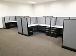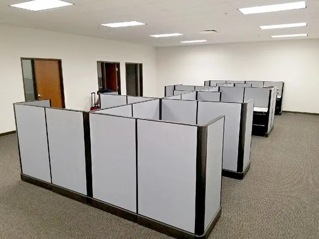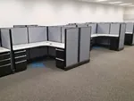 We made a straightforward office layout with a cubicle workstation cluster of ten 5’ x 6’ L shaped cubicles with 53”H mid-height office partition panels. Each cubicle desk includes a box box file pedestal and file file pedestal for locking storage.