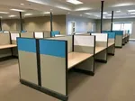 To add a splash of color to the earth-tone office color palette for a bright & happy workplace, each cubicle row shows a teal blue acoustic panel fabric on the 53”H wing panels from our O2 Style Finish Program.