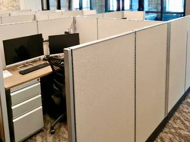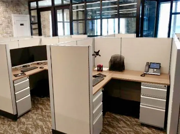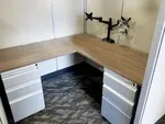 Each L-shaped cubicle includes a box box file pedestal on each side of the workstation desk for document storage and pc monitor arms as a desk space saver solution. Both of the workstation clusters have integrated electrical and data cabling pulled from either a wall outlet or through the ceiling via an office power pole.