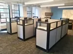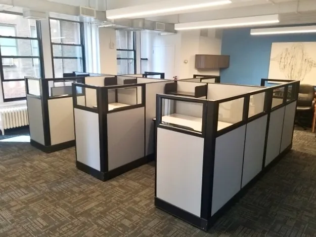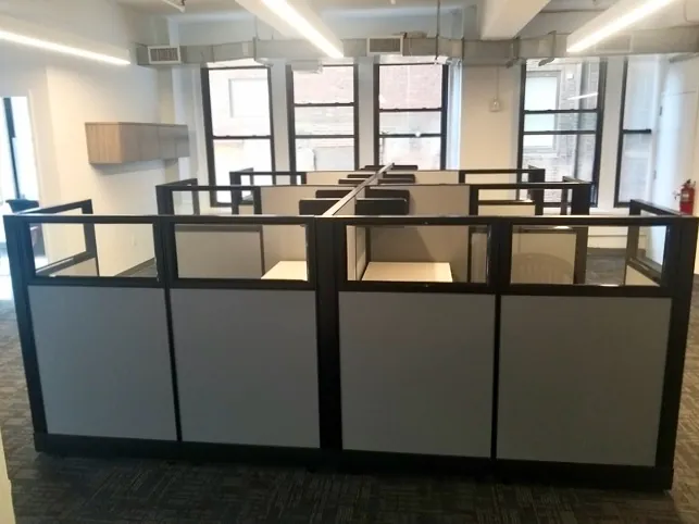 For Jericho’s office space in NYC we worked with the O2™ Office Cubicle System to create a simple cluster of 5x5x53”H cubicles with glass windows. Since the organization has a vast network, a large number of cases, and a ton of files and folders, the office space plan includes plenty of wall mounted office storage cabinets as well as a filing cabinet with shelves above in each cubicle workstation .
