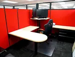 Private cubicle offices with locking office partition doors are sized 8’x11’ with 85”H cubicle walls. They’re roomy enough to accommodate a u shaped desk with space for 2 desk guest chairs in front of the D-top desk surface – the peninsula shape makes it a great meeting desk. The corner work surface at the back is supported by a standing desk mechanism underneath. Including a sit to stand desk in modern workstations has become a very popular workplace wellness trend.
