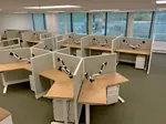 18 of the customer service desks are straight desk cubicles with a 3.5’x5’ work area, surrounded by 53”H fabric partition panels. There’s also a 6pack of 120 degree workstations arranged into what we call a “dogbone layout” of V-shaped desks.