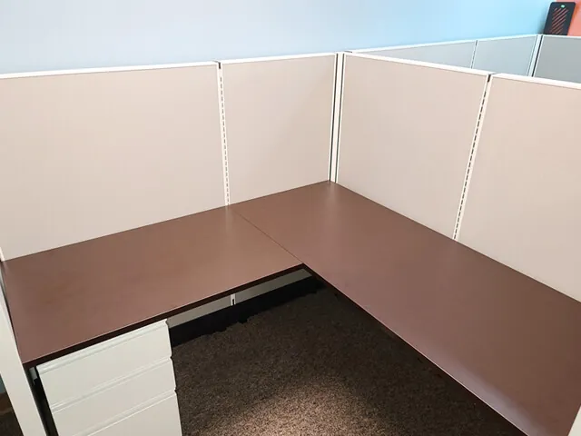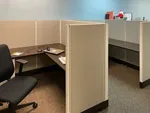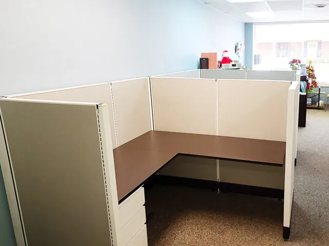 The client opted for neutral office furniture finishes for their new cubicle desktops to match the existing office color palette, making the workstation cluster blend in effortlessly with their already welcoming office environment.