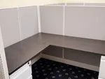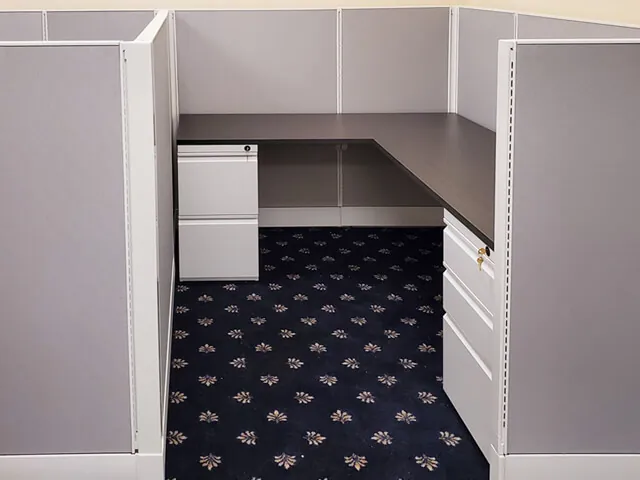 A subdued cubicle color scheme was specified to provide a soft contrast against the decorative blue office carpet, resulting in a high-end, stylish office look.