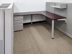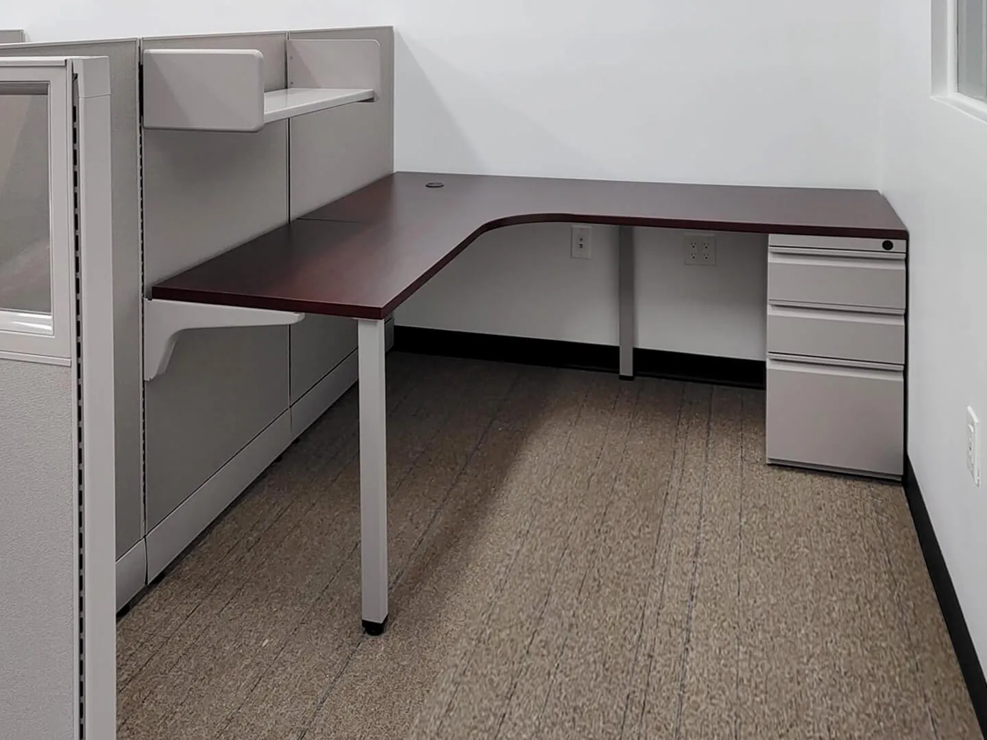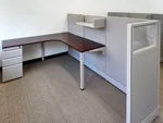 Our design team created three L shaped cubicles featuring a rich mahogany wood laminate L shaped cubicle desk for a sophisticated and professional look. These large office cubicles were designed to offer sufficient room for employees handling multiple tasks simultaneously. To enhance the sense of openness, we prioritized specifying cubicles with glass panels along the aisle side, allowing natural light to flow through the space. The workstations also included white desk pedestal units and open cubicle shelves as part of the overall office storage solutions strategy, ensuring a clutter free workspace.
