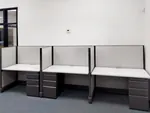 To meet their needs, we supplied 3 small cubicle workstations, arranged a single cluster of three modular office cubicles to create an efficient and compact workspace. Each workstation was equipped with a box box file pedestal for added storage and functionality. To ensure uniformity with the modern office décor, we specified neutral cubicles that complemented the client’s existing corporate environment. Additionally, the workstations were equipped with power capabilities, ensuring seamless PC and phone connectivity for employees working within the open office space.