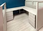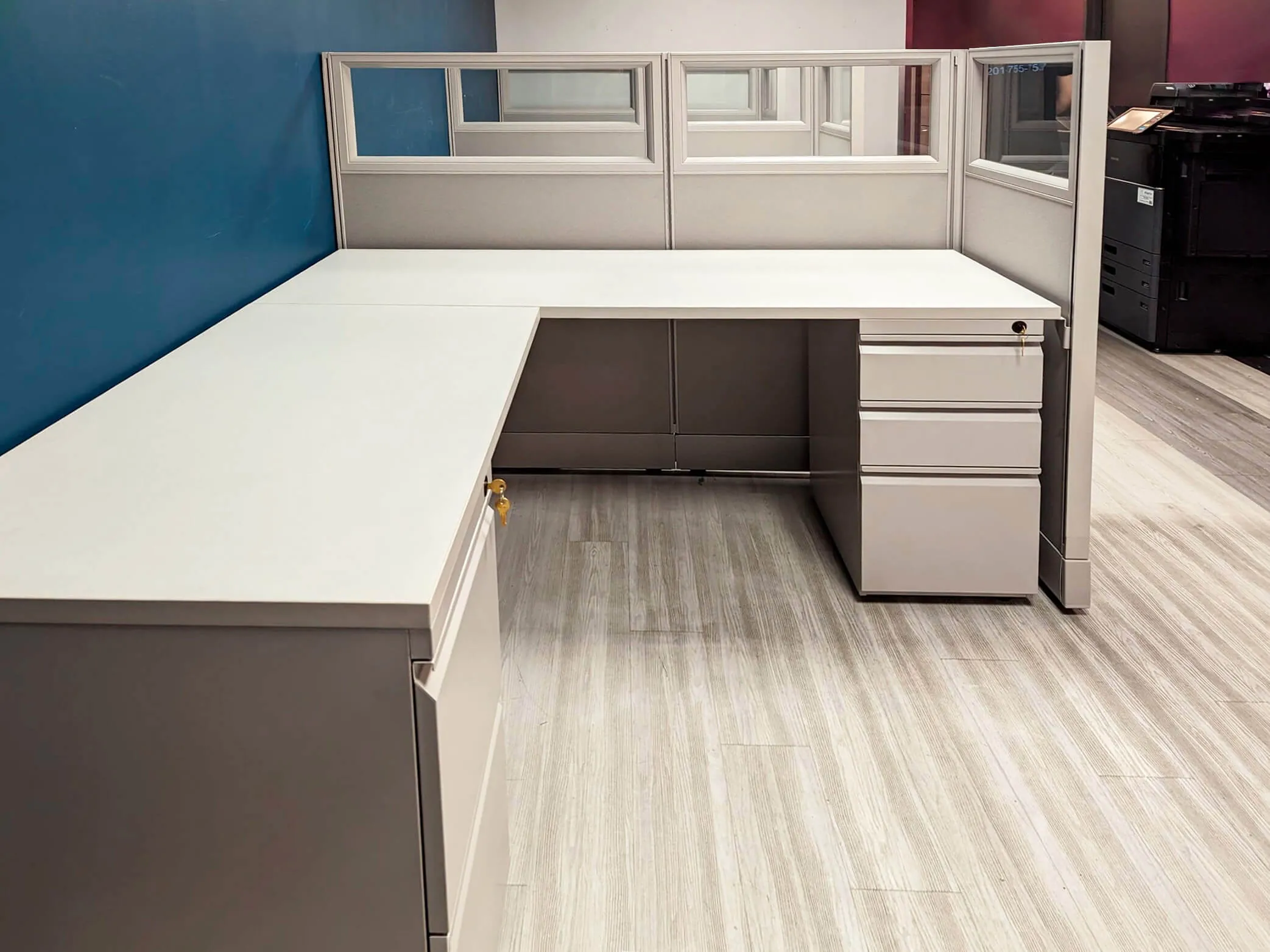 Each modular workstation features a 5’6” x 5’6” L shaped cubicle desk and was equipped with both a file file pedestal and box box file pedestals, ensuring an organized and clutter-free workspace. The modular office cubicles were designed to maintain efficiency and professionalism while maximizing the usability of the open plan office space.
