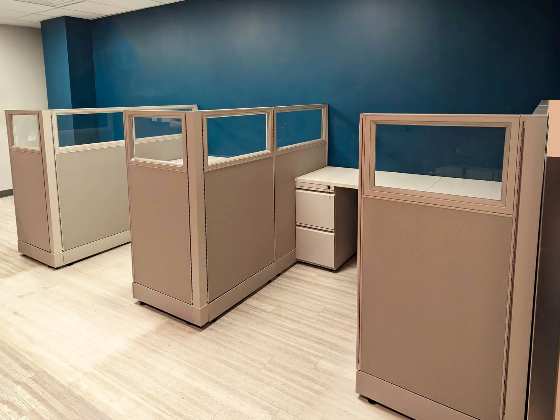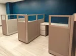 To meet their needs, we installed three cubicles with glass panels, in neutral cubicle shades with white cubicle desks.