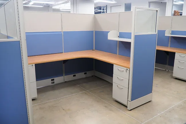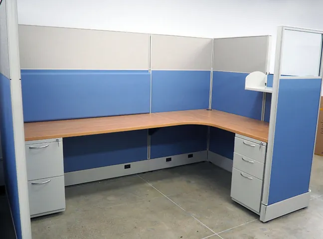 Our custom office design of L-shaped workstations range in cubicle sizes, including 8’x5’, 7’x6’, and 6’x5’. The 66” high cubicle walls with a smattering of cubicle windows provide sufficient desk privacy. Each station includes over-desk storage shelves and lockable desk pedestals.
