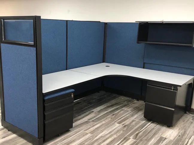 Since the client's workflow heavily depends on keeping case files, binders, and paperwork organized, we equipped every station with locking overhead storage cabinets, a 2 drawer pedestal file cabinet, and a mobile pedestal with seat cushion that matches the deep blue cubicle fabric available in our O2 Style Program.