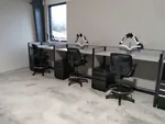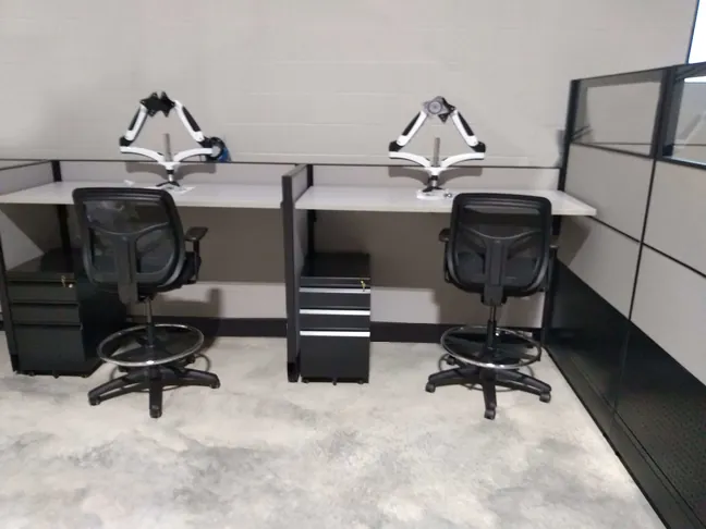 The customer service cubicles are unique cubicles configured to be fixed standing desks with drawers and desk mounted monitor arms. Every station has a drafting chair with footrest.