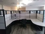 The Ops Dept. needed large office workstations so we gave them 8’x10’ u-shaped cubicles in a 2-by-2 coworking setup. The shared worksurface serves as a mini-conference table or work partner desk. Each unit has a corner sit stand desk with dual monitor arms to encourage healthy movement throughout the workday. Using the FiT ™ tiled system, 66”H custom cubicle panels have a sharp mix of steel, fabric, and glass tiles.