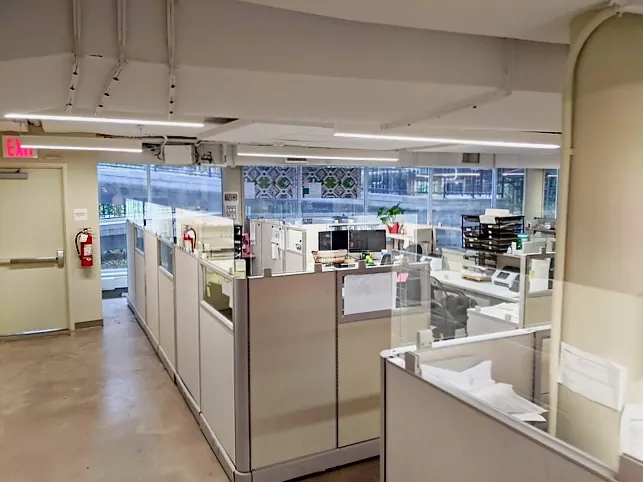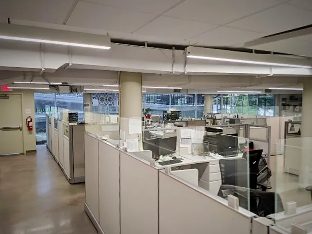 To facilitate a safe return to work, our interior office design pro developed a strategic “Plexi Protection Plan” for all open office cubicle desks in multiple facilities – this is one of many. We added clear acrylic panels to the tops of all cubicle panels where people needed a safe physical barrier between faces, while still having full audio and visual interactions.