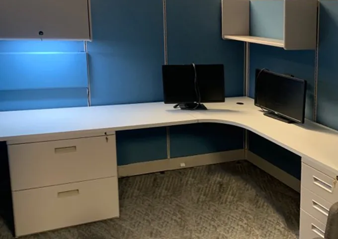 We used L shaped cubicles to provide all employees with a spacious office desktop. As an office storage solution, we equipped every cubicle desk with an office cubicle shelf, an overhead storage bin, a lateral file cabinet with lock and a box/box/file pedestal. These office storage options provide plenty of space for keeping paperwork and personal belongings organized and neatly stowed away.