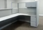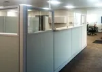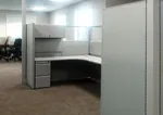 In Area C, we provided 6 additional powered L shaped cubicles and a cluster of two cubicles with glass panels, plexi screens and office counter tops that acts as a transaction counter to facilitate exchanges between coworkers or visitors. To create an element of visual and practical continuity, we teamed each of the cubicle workstations with the same office storage options as described above.
