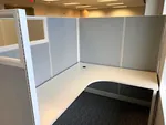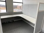 All cubicle office stations in this project have large L shaped desks and tall cubicle walls with windows, except for the cubicle desks in the corner office.</p>