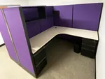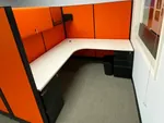 The cubicle office desks exhibit a large desk worksurface that affords the user optimal comfort when performing tasks. Each workstation desk was equipped with both a box box file pedestal and a file file pedestal, as well as an overhead storage bin and an open shelf providing a good variety of office storage options.