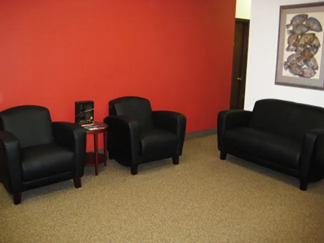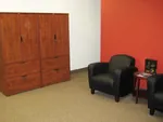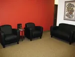In the waiting room we worked with lobby furniture that would complement their burnt orange accent wall. A comfortable black leather office couch and two matching waiting room chairs provide sophisticated guest seating. Cherry wood 2 door cabinets with drawers complete the room and maintain the same warmth of the office wall colors.</p>