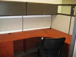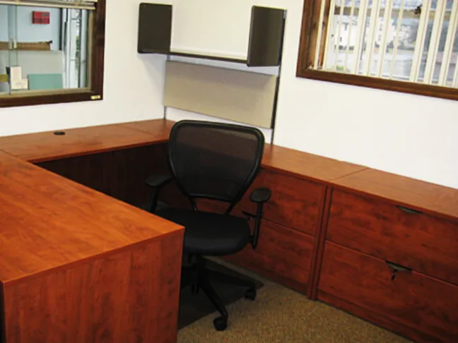 Our office designer created a built-in office furniture solution for the reception desk design using custom cherry wood desks with pedestals wrapping the walls beneath the reception window. Cubicle walls mount to the office wall for privacy and stability, and wood lateral file cabinets line the remaining wall space and double as extended work surfaces.</p>