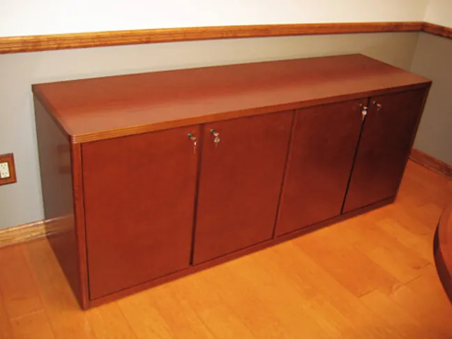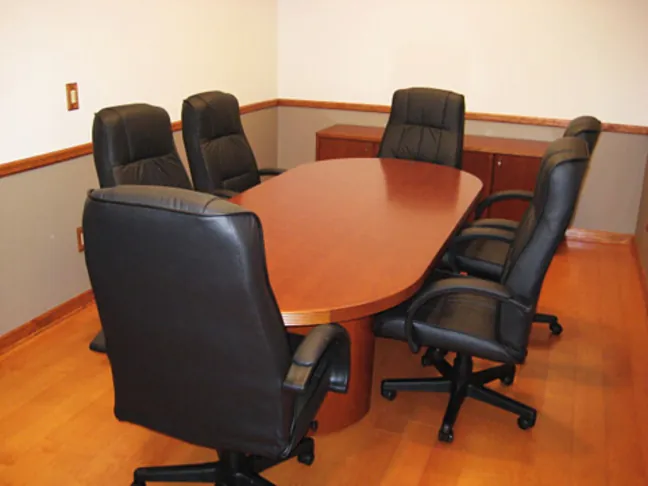 An equally well-crafted custom credenza lights up the conference room and matches the racetrack conference table surrounded by six high back executive office chairs.</p>