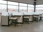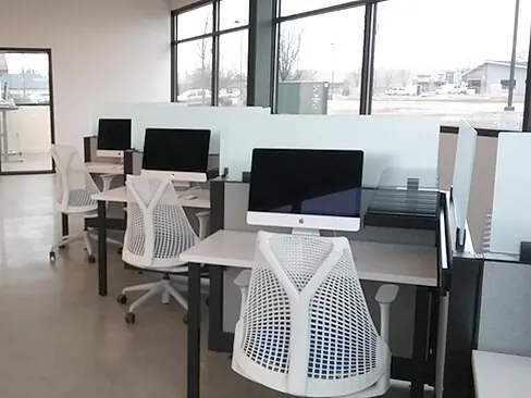The team of 8 agents are usually in the field or the meeting spaces but needed simple call center desks to touch down with a phone and computer from time to time. We used Optima™ Open Office Workstations in a staggered “zig zag” desk configuration with frosted glass divider screens and ultra-modern white office chairs with light blue chair cushions.