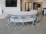 When real estate buyers first enter the space, they’re greeted at a smoked walnut Enchant U shaped reception desk. Then they’re escorted to a showstopping centerpiece, the Intima collaborative seating system, to have a seat in front of the media wall. A standing height counter wraps around the back of this multipurpose furniture with bar height chairs to serve as an additional pause area.
