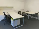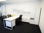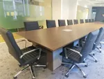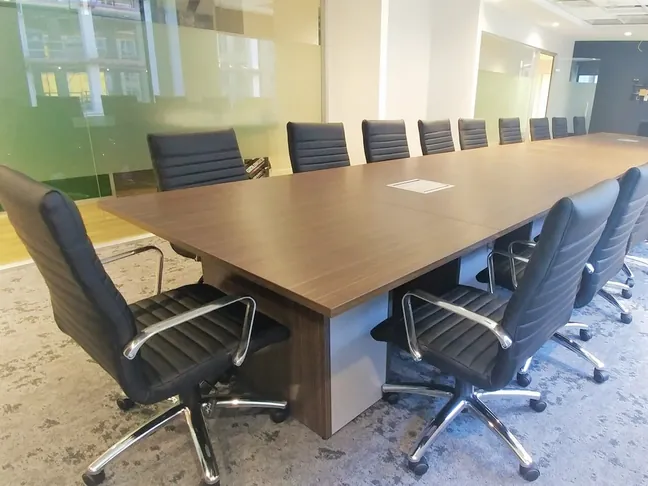 The only areas where we deviated from this office theme were the meeting rooms, where we balanced all the white with chocolate woodgrain boardroom tables with power outlets and data integrated into the tops.