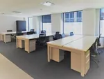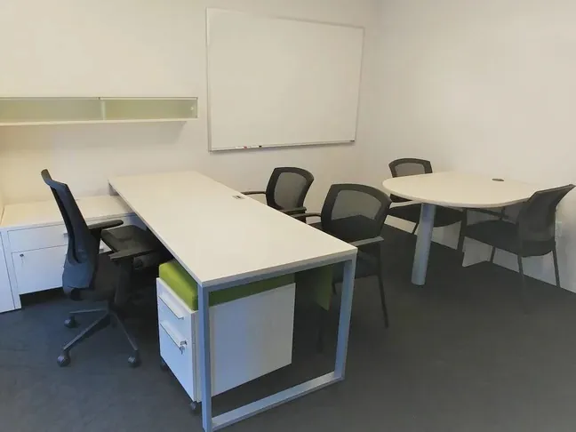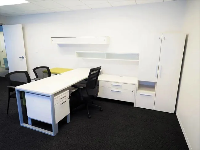 We focused primarily on bright, white office furniture throughout the entire space with accents of silver, charcoal, and apple green for a nice pop of energetic color. The consistent office color palette unites the modern modular desks in the 18 executive offices with the 74 modern bench desks in the open offices.
