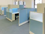 Cubicle panel heights varied from 50”-60” depending upon the location of each workstation cluster and proximity to windows. For office cubicle accessories we included a cubicle wall storage bin overhead, 2 file cabinets with drawers under the desktop, and 1 led task light under cabinet. All bins & drawers are lockable office storage cabinets.