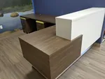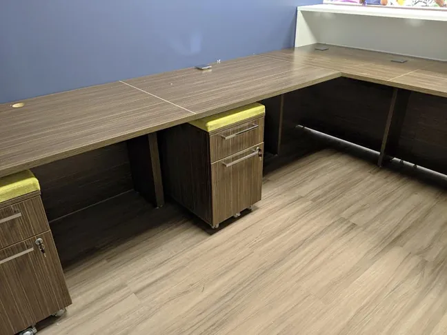 This project was short and sweet, involving just one modern reception station. In order to fit perfectly within their welcome area and accommodate two receptionists, we designed a custom reception desk sized 6’x10’. Two mobile filing cabinets with brightly colored cushioned tops provide the receptionists with plenty of storage for company documents and personal items. Putting the filing drawers on wheels allows them flexibility and freedom to move around the work area. The reception design and finish selections reflect Center’s corporate goals to keep up with ongoing office furniture trends.