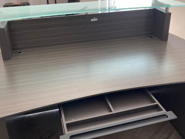 Our elegant Esteem reception area desk was a clear winner. This beautifully curved desk features a functional center desk drawer and a chic glass transaction top with silver details, to create a remarkably sophisticated look in any office waiting area.