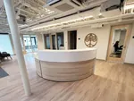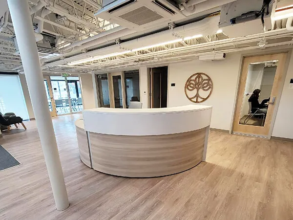 We specified a stunning curved reception desk featuring a large desktop as a statement piece for the office reception area.