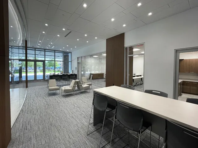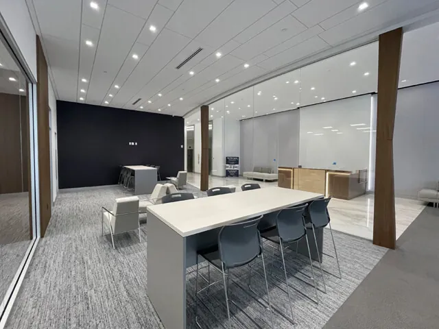 The different office lounge areas feature modern office coffee tables, bar height office tables, and collaborative tables. Each office lounge area was equipped with diverse office seating such as, a 3 seat lounge sofa, mid back office chairs, office lounge chairs and bar height office chairs.
