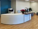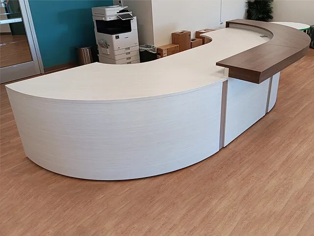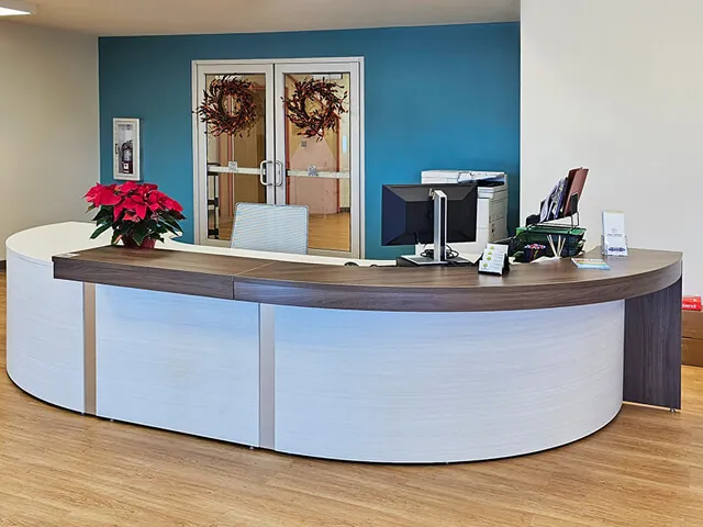 To complete a spacious receiving area in their Arkansas office space, our client ordered this visually stunning curved reception desk. It offers the ideal fusion of functionality and elegance, making it a great choice for expansive lobbies and reception areas. Designed with beautiful, flowing workspaces, this reception desk with counter caters for those who value both practicality and a sense of sophistication. The dual tone color combination of this front desk counter design organically matches the neutral tones of the reception area, creating a muted backdrop for the vibrant accents in the open office space. Its modern office design seamlessly blends with an astonishing array of reception furniture pieces, providing a welcoming and stylish first impression for visitors.