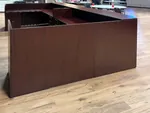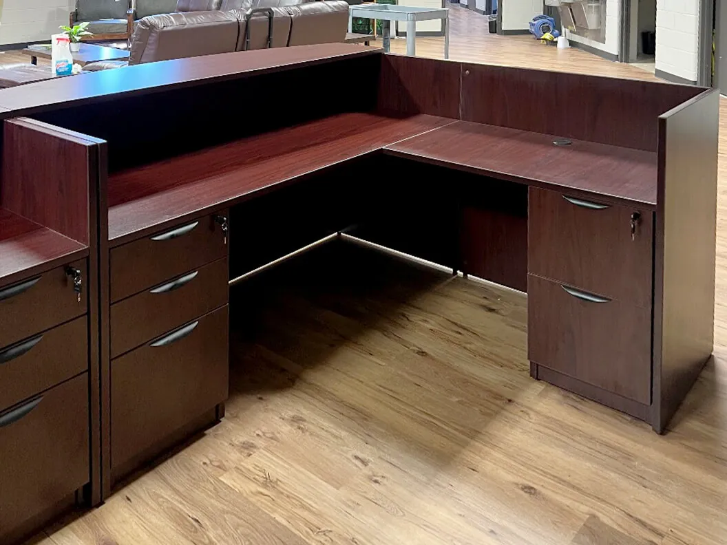 To meet these needs, we installed a 2 person reception desk in the receiving area, designed as a reception desk u shaped configuration. This was achieved by combining two L shaped reception desk units, each featuring a curved transaction counter for easy communication. The desk was finished in a rich mahogany laminate for a refined, professional appearance. To ensure ample functionality, we integrated a 2 drawer pedestal and a box box file pedestal at each workstation, providing essential office storage solutions for daily office needs.