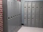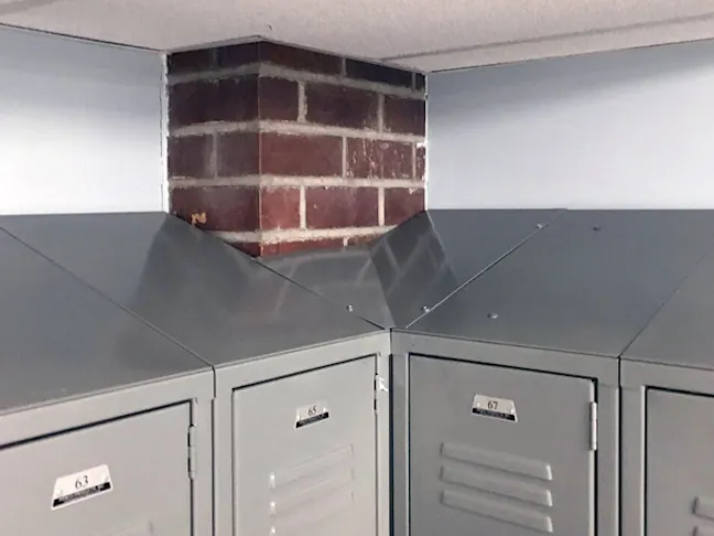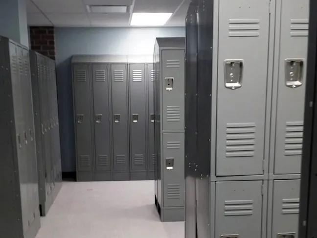 We specified a neutral light grey powder coat finish for the more than 250 metal locker cabinets, which helps the space feel simple and uncluttered, and highlights the historic exposed brick interior.
