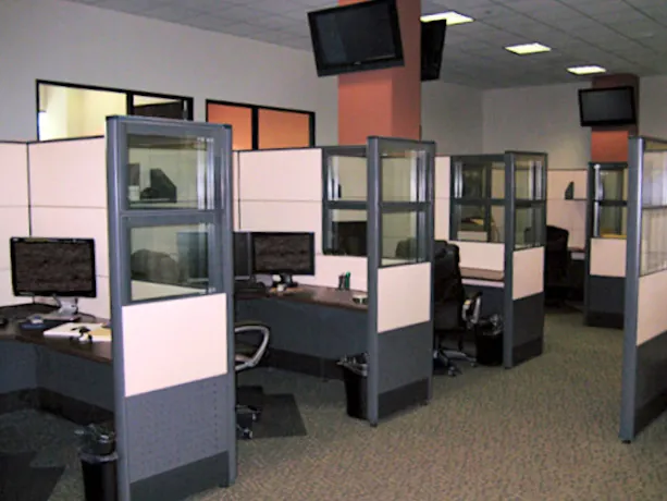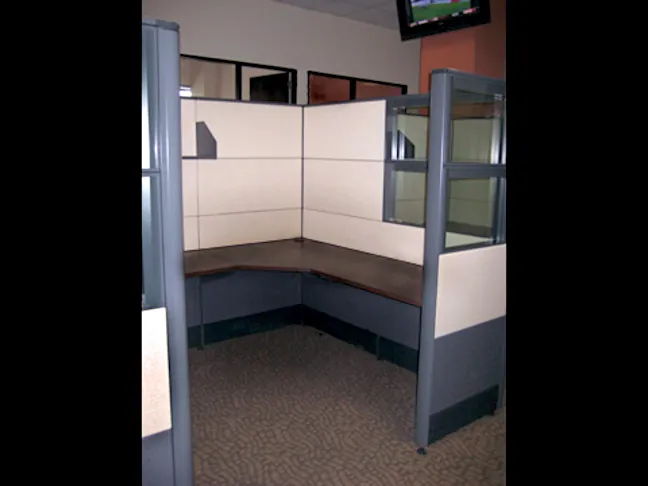 Their office square footage was plenty of room for an office space plan of 6x6 cubicles with 70”H desk partitions for privacy and individual focused workflows. The modular panels along the aisles include cubicle windows to prevent workers from feeling too isolated and boxed-in. Each desk configuration includes a box box file pedestal and cubicle storage shelves.