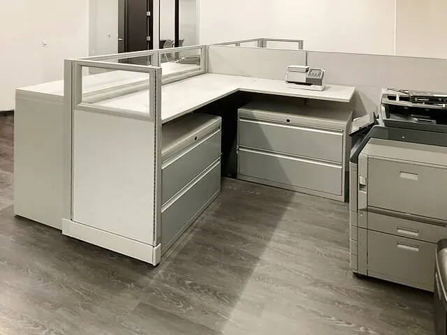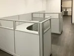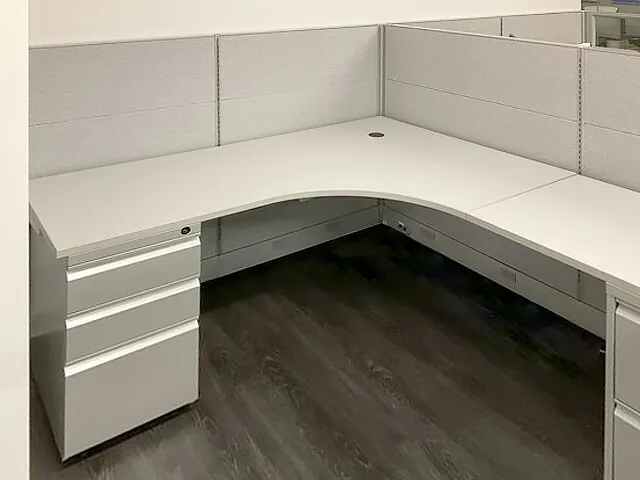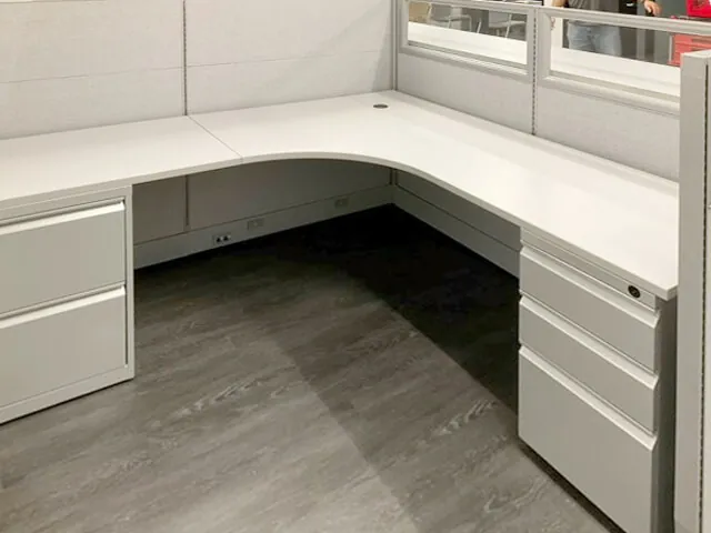 Open Area #3 is designed with two 7'-6" x 6' x 53"H powered L-shaped cubicle, each featuring a box box file pedestal, a 30"W lateral file, and a dual monitor arm mount, optimizing comfort and efficiency.