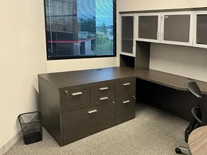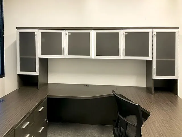 The three private offices are designed for both functionality and organization. Office #8 features a U shaped office desk, overhead storage, and a round meeting table, creating a versatile and well-organized space. Offices #6 and #7 also feature large U shaped desks with mixed office storage units, ensuring ample worksurface and storage capacity.