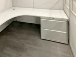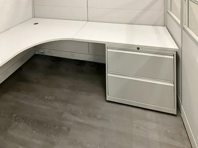 Open Area #1 features a new 5'-6" x 7'-6" x 53"H powered workstation, equipped with a box box file pedestal, a 30"W lateral file, and a dual monitor arm. This spacious white and grey cubicle setup ensures ample storage and workspace for employees.