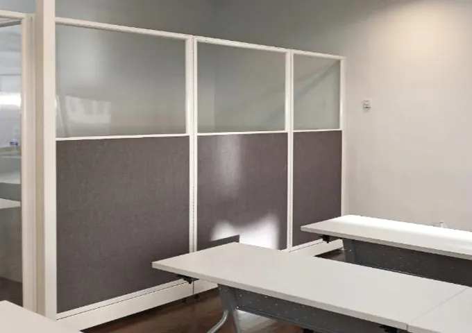 For their office space in Chicago, they came to us looking to add an office training room to their office layou. The solution had to keep the training area separate from the equipment zone and office pantry area. Our office interior design team provided a modular wall system that is affordable, reusable, and easy to mount. The modular office walls used in this project are 85” high and have partially glazed stacker panels to facilitate the flow of sunlight, filling up the office space.