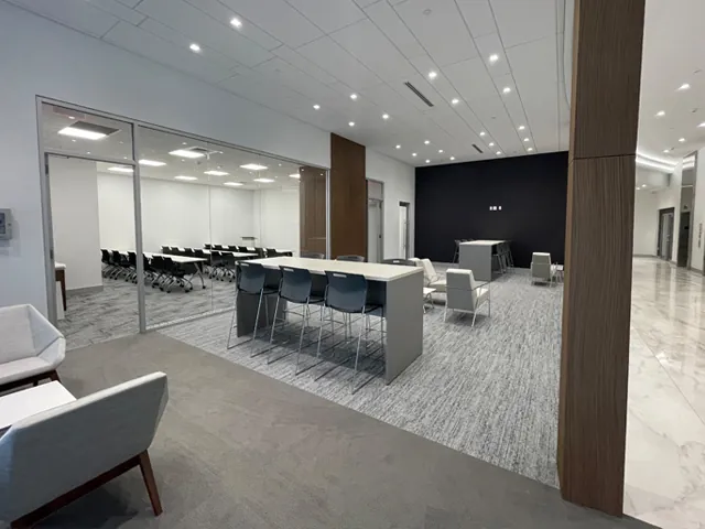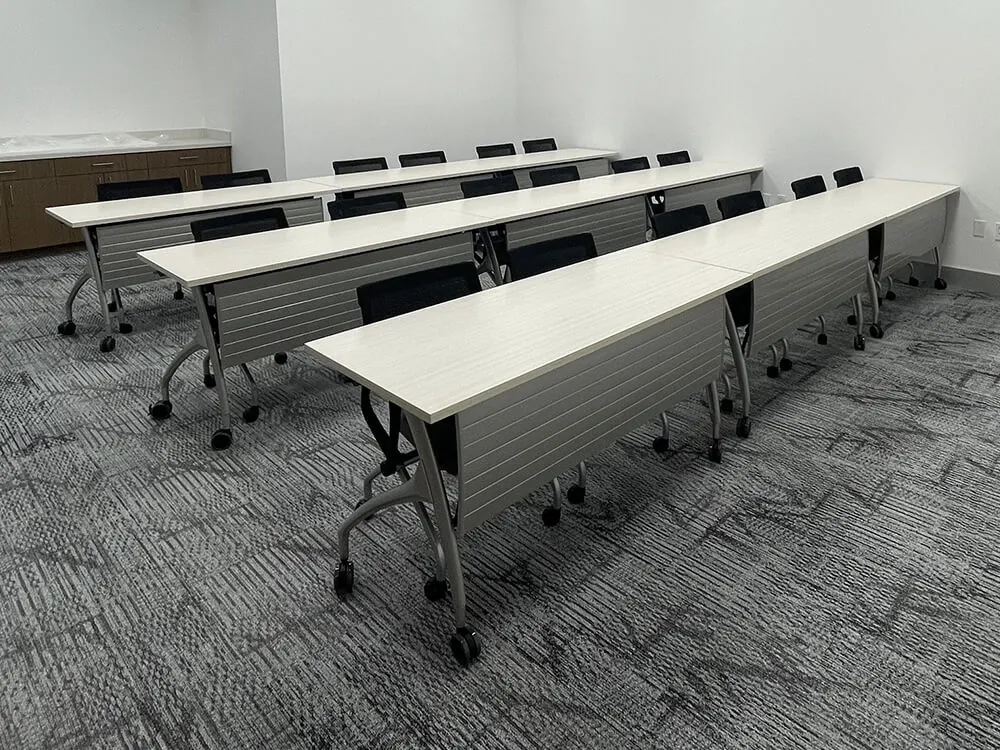 Through another glass office partition we can see a spacious office training room equipped with office training tables; paired with training office chairs. These tables are designed to take up little space when not in use, and their office desk casters make them easy to move, allowing space to be used for other purposes if necessary. This training room was also equipped with a convenient portable lectern acting as a podium during presentations.