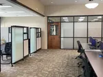 These private cubicle offices were placed against a line of windows and designed with glass panels and frosted glass cubicle doors to allow natural light to flow into the office and were paired with mesh-backed task chairs as well as black guest chairs.