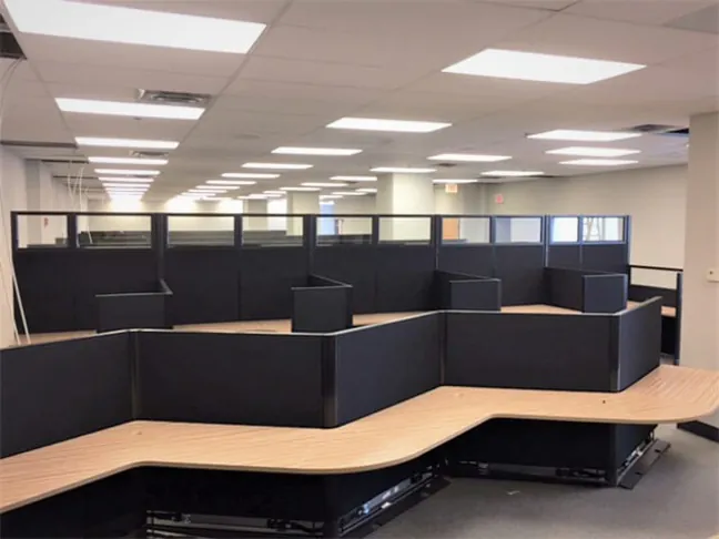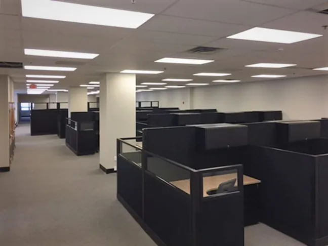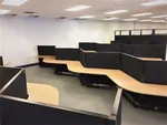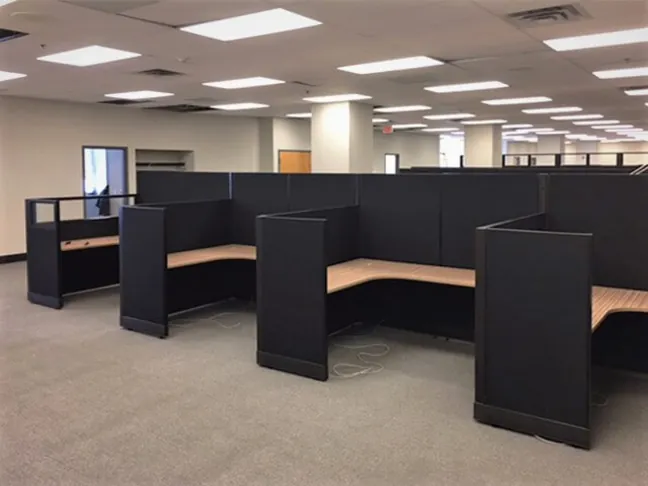 A team of 34 employees required individual privacy for focused work, and ample office storage space. 5’x6’ L shaped cubicle workstations fit into the available square footage nicely. 67” tall cubicle walls along the spines enhance privacy between users and host overhead storage bins and tackboard panels. 53”H cubicle panels enclose the rest of each desk area for moderate privacy.