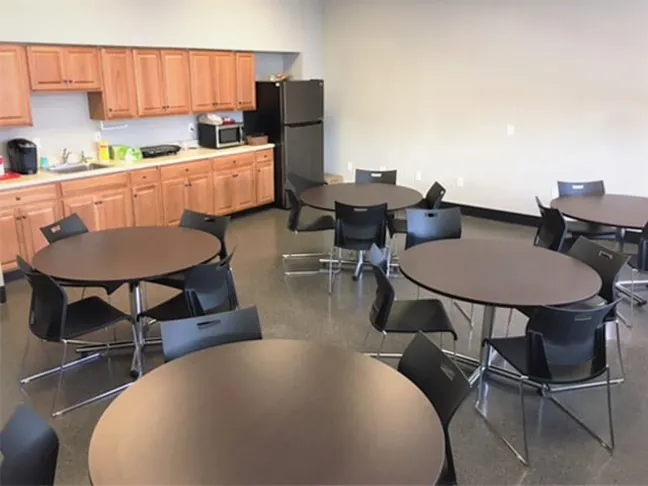 The client wanted “simple & sophisticated” office colors. With ample natural and artificial light available, we felt confident playing with elements of a black office interior, offset by warm woodgrain laminate desks. Black café tables and chairs in the breakroom echo the sharp sentiment.