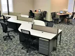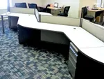 This “bench” type of office desking system is characterized by low cubicle walls, continuous worksurfaces with minimal separation among individual workspaces, and a desk arrangement that keeps co-workers face to face.