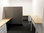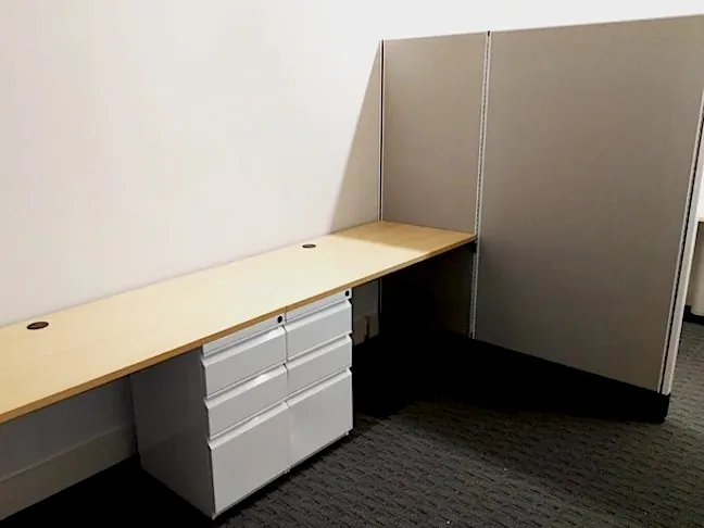 Strategically placed 67” tall grey cubicle panels (mounted to the wall for stability) add an element of privacy between work areas.