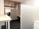 We specified two small workstations for the junior staff and made the most of the back wall by devising a custom sized wall to wall desk with return for their manager. We also added a 7’ counter height wall mounted table with square desk legs to function as an occasional standing height desk.