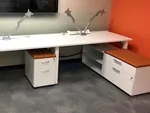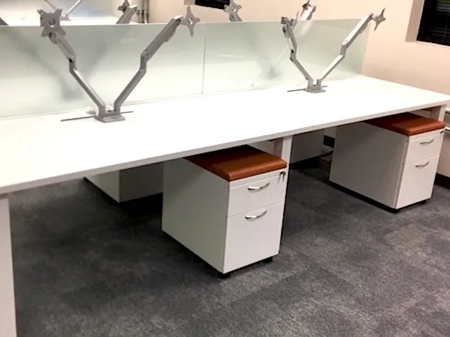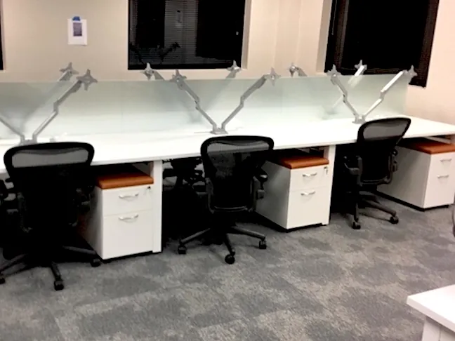 We specified 30”x60” modern office benching workstations from AIS Furniture with dual monitor arms in the open plan office. This modular desk system includes details like recessed power outlets, frosted glass privacy screens, and a cushion-top filing cabinet on wheels.
